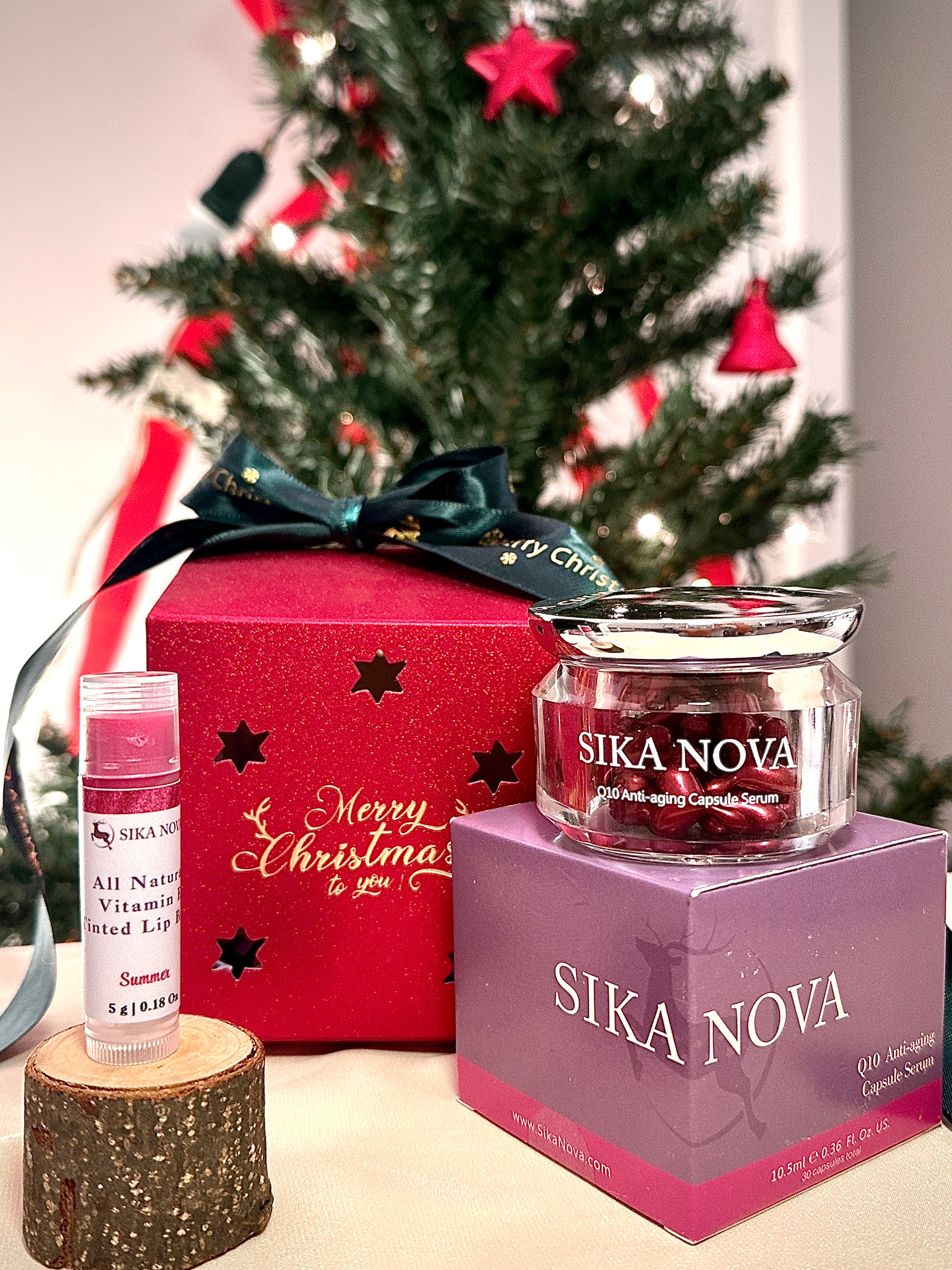 Give the gift of glowing skin this holiday season with our Sika Nova Capsule Serum (30 capsules) and all-natural Tinted Lip Balm set. This thoughtful duo brings hydration, nourishment, and comfort — everything a skincare lover needs during the winter months.